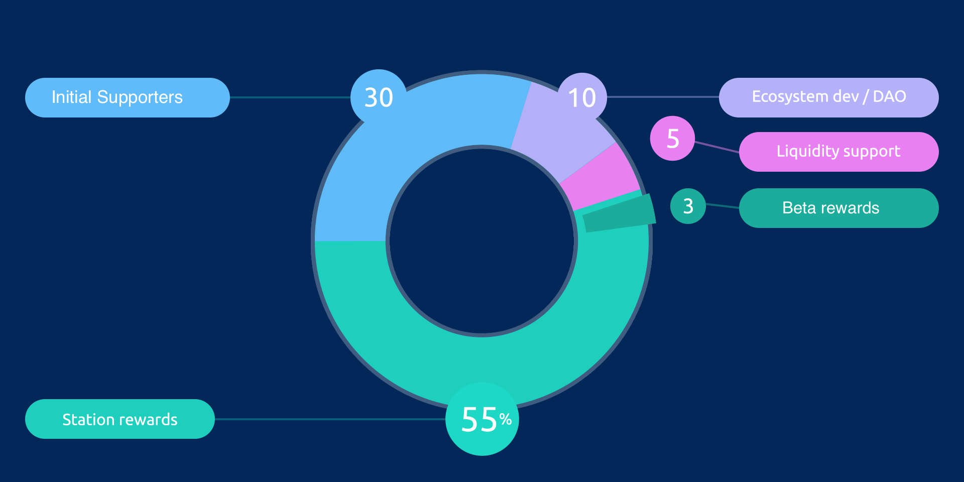 - 3M tokens will be distributed to station owners that participated in the Network during its beta phase. See more at Reward Boosts