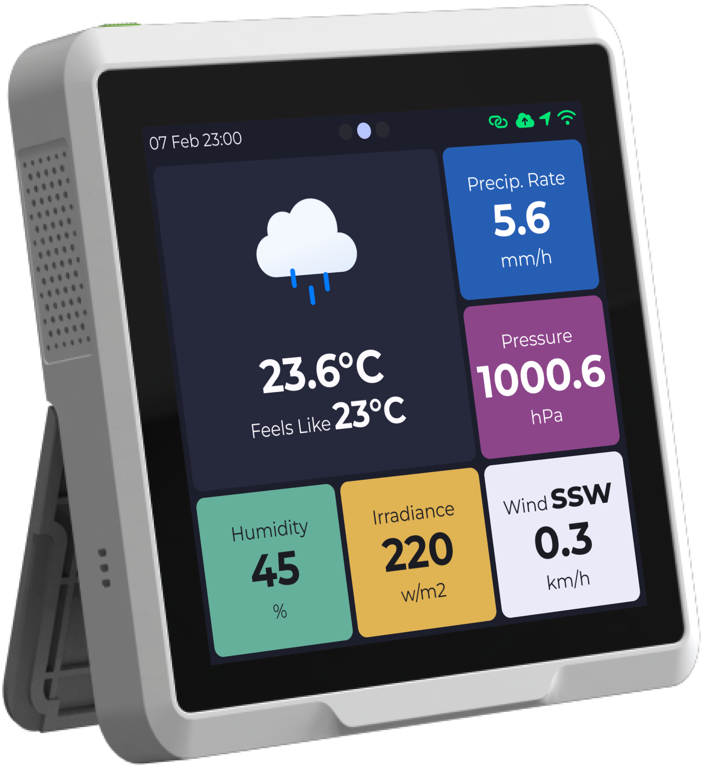 The weather station comes together with the WG1200 Gateway. The WG1200 Gateway receives all the meteorological data plus the location of the weather station, which are measured and transmitted every 16 seconds by the outdoor sensor and displays them on its screen.