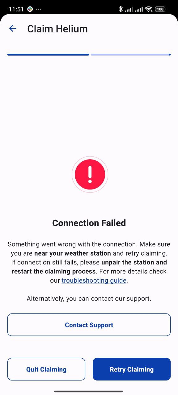 if you experience connection issues while claiming a WeatherXM Helium station, make sure you are near the station.